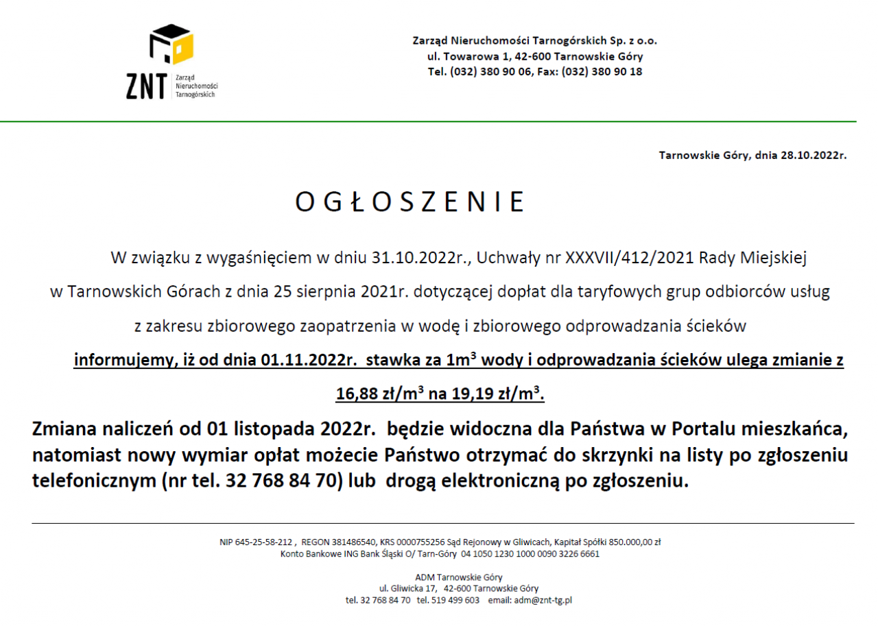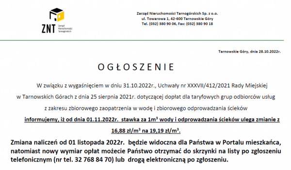 Zmiana stawki za wodę oraz odprowadzanie ścieków od 01.11.2022